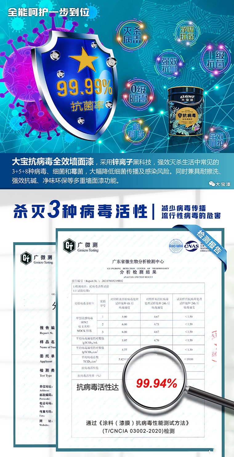 因應(yīng)日趨嚴(yán)峻的疫情,大寶抗病毒全效墻面漆的誕生猶如一場及時雨,給予我們實(shí)質(zhì)上的安全感,全方位締造健康安全的居室空間。