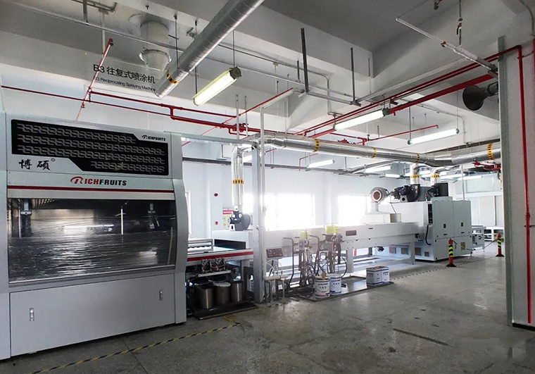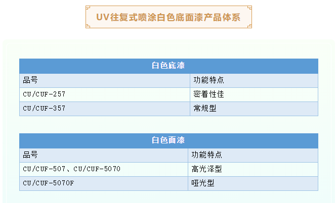 素材→UV往復(fù)式噴涂白色底漆(60-80g/㎡)→UV固化→輕砂→UV往復(fù)式噴涂白色底漆(100g/㎡)→UV固化→UV往復(fù)式噴涂白色底漆(100 g/㎡)→UV固化→砂光→UV往復(fù)式噴涂白色面漆(100-120 g/㎡)→UV固化