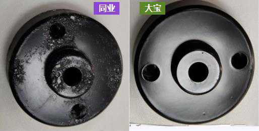 大寶漆與同業(yè)水性黑色啞光金屬烤漆在鋅合金素材上耐鹽霧500小時(shí)對比測試結(jié)果: