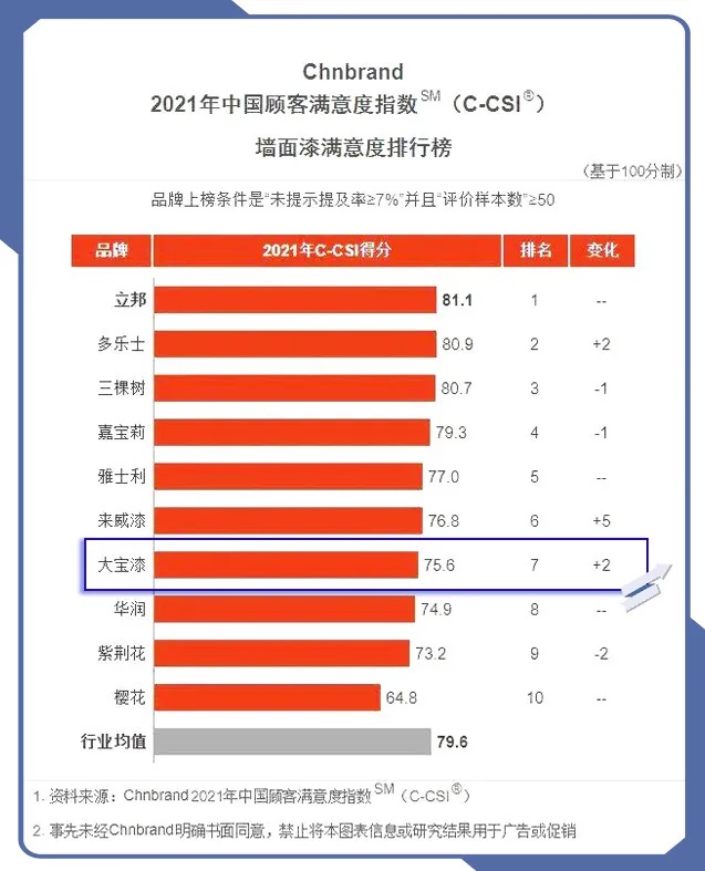 7月20日,品牌評(píng)級(jí)權(quán)威機(jī)構(gòu)Chnbrand發(fā)布2021年度(第七屆)中國(guó)顧客滿(mǎn)意度指數(shù)(C-CSI)品牌排名及分析報(bào)告。大寶墻面漆與木器漆分別以第七、第九的優(yōu)異排名入圍榜單,其中墻面漆較去年排名上升了2位,木器漆較去年上升了1位。