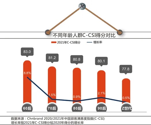 2021年C-CSI研究成果發(fā)現(xiàn),在不同的人群前面,不同的顧客滿(mǎn)意度表現(xiàn)出明顯差異,60后的滿(mǎn)意度增長(zhǎng)最快,而Z世代的滿(mǎn)意度則持續(xù)處于較低水平。人群在滿(mǎn)意度的差異表現(xiàn)也預(yù)示著企業(yè)對(duì)于用戶(hù)的精細(xì)化的管理時(shí)代的到來(lái)。