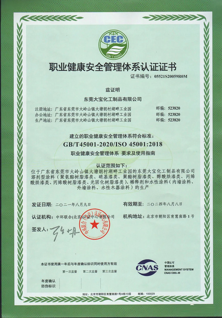 近日,大寶漆正式通過GB/T45001-2020/ISO45001:2018職業(yè)健康安全管理體系認證,意味著大寶漆獲得國際權威機構認可,將為公司后續(xù)的安全穩(wěn)定與可持續(xù)的長遠發(fā)展提供強有力的保障。