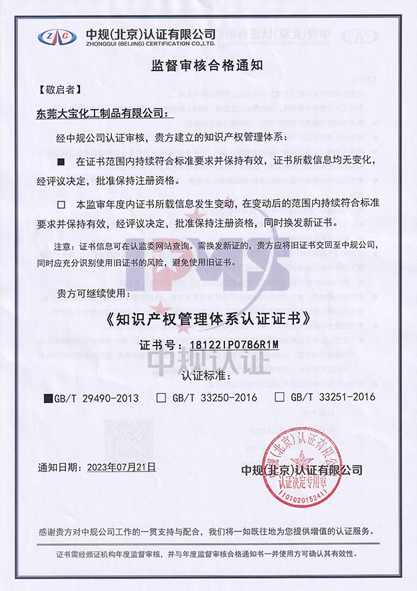 大寶化工作為國(guó)家知識(shí)產(chǎn)權(quán)優(yōu)勢(shì)企業(yè),長(zhǎng)期致力于研產(chǎn)銷“建筑涂料、木器涂料、金屬涂料、塑膠涂料”,得益于公司重視專業(yè)、創(chuàng)新的經(jīng)營(yíng)理念,致力于知識(shí)產(chǎn)權(quán)等工作的不懈努力,近期在知識(shí)產(chǎn)權(quán)工作方面取得了顯著進(jìn)展。