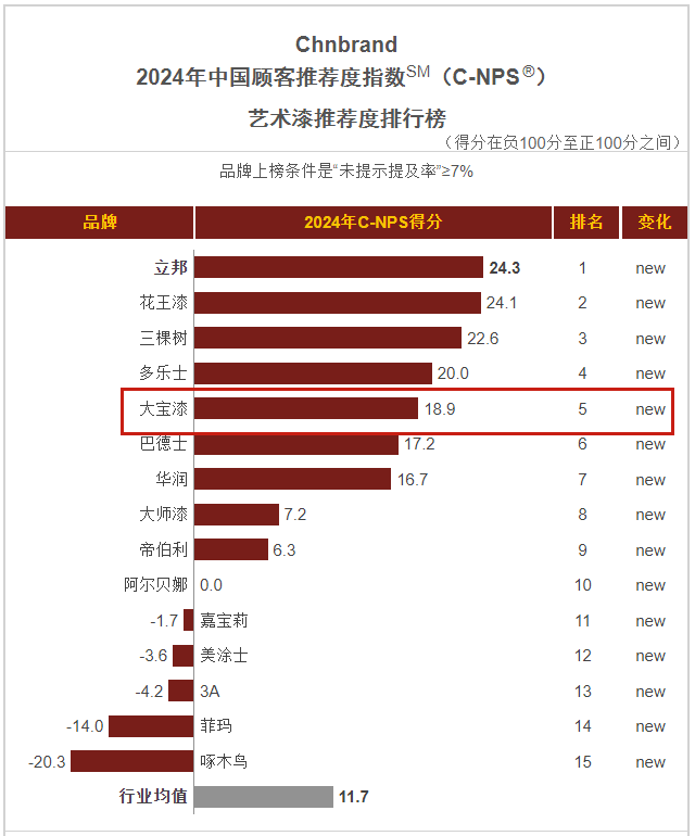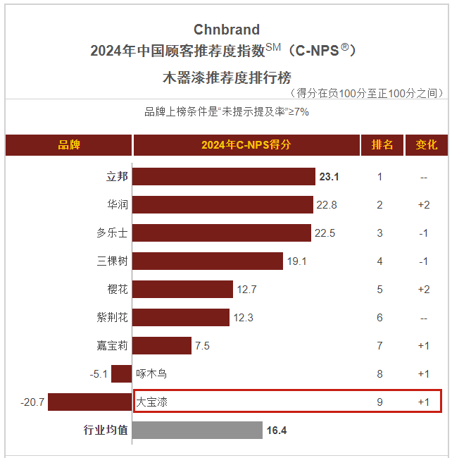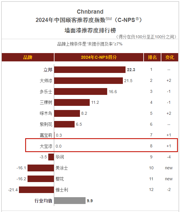1月,品牌評級權(quán)威機構(gòu)Chnbrand發(fā)布2024年(第十屆)中國顧客推薦度指數(shù)(C-NPS)品牌排名和分析報告。大寶墻面漆、木器漆、藝術漆分別以優(yōu)異的口碑入圍排行榜單。