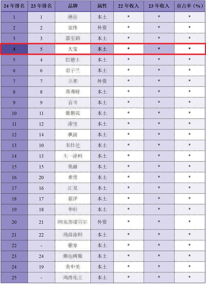 10月10日,國內權威涂料工業財經媒體《涂界》(Coatings World)發布了“2024中國家具漆品牌TOP 25”排行榜,匯集了國內最具影響力的家具漆品牌。大寶漆憑借卓越的市場表現榮登第4名,較去年上升一位,連續多年穩居家具漆行業頭部品牌之列,展現了其強大的品牌實力與行業領導地位。(數據來源:https://mp.weixin.qq.com/s/s_wiCGDU7ofTQnuvKh0n2Q)