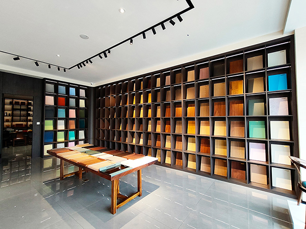 作為本次經(jīng)銷商大會(huì)的壓軸行程,與會(huì)嘉賓在午宴后前往山東大寶家具漆服務(wù)中心深度考察。步入展廳,極具現(xiàn)代感的色板陣列即刻映入眼簾—木器漆呈現(xiàn)天然肌理之美,金屬涂層閃耀科技光澤,塑膠與玻瓶的表面處理更突破傳統(tǒng)工藝邊界。
