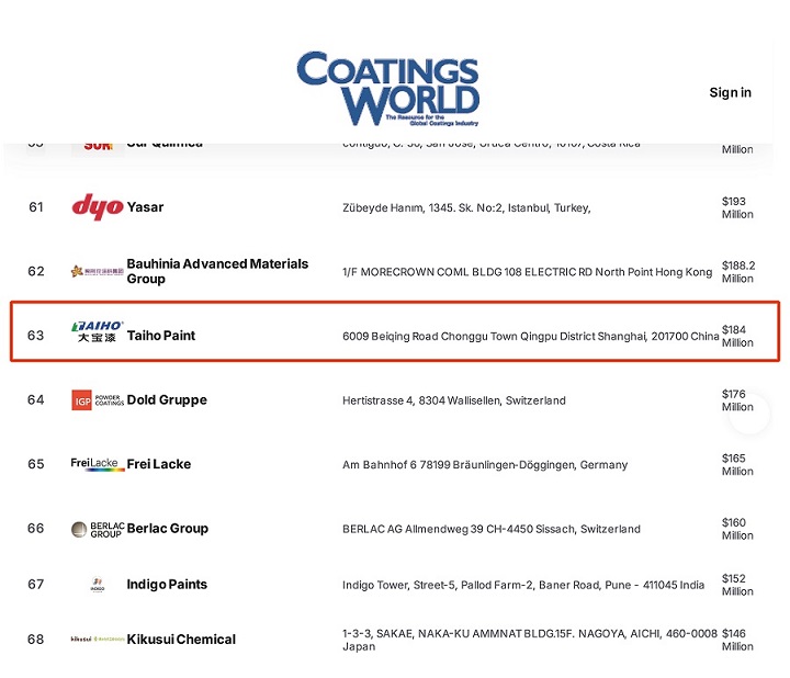 大寶漆連續(xù)多年躋身全球頂級(jí)涂料企業(yè)行列