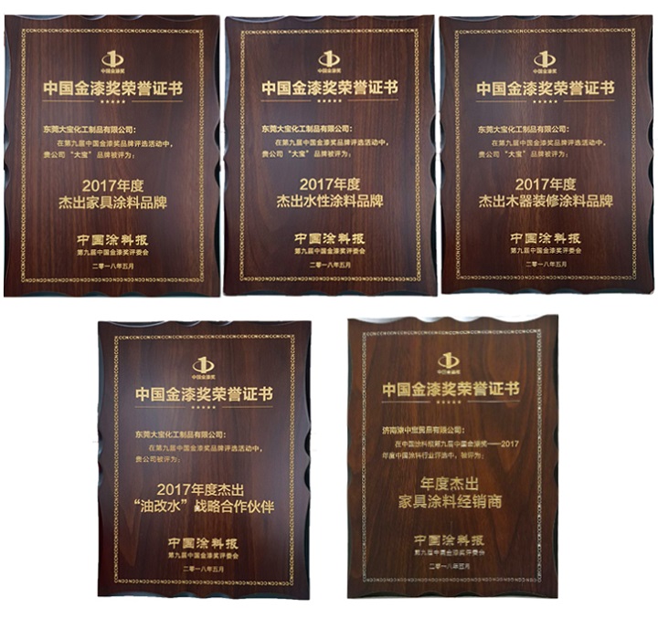 作為民族涂料品牌,大寶漆在金漆獎頒獎典禮斬獲2017年度“杰出木器裝修涂料品牌”、“杰出家具涂料品牌”、“杰出水性涂料品牌”、“杰出油改水戰(zhàn)略合作合伴”等四項殊榮。同時,大寶漆山東經銷商濟南漆中寶貿易有限公司獲得2017年度杰出家具涂料經銷商獎項。