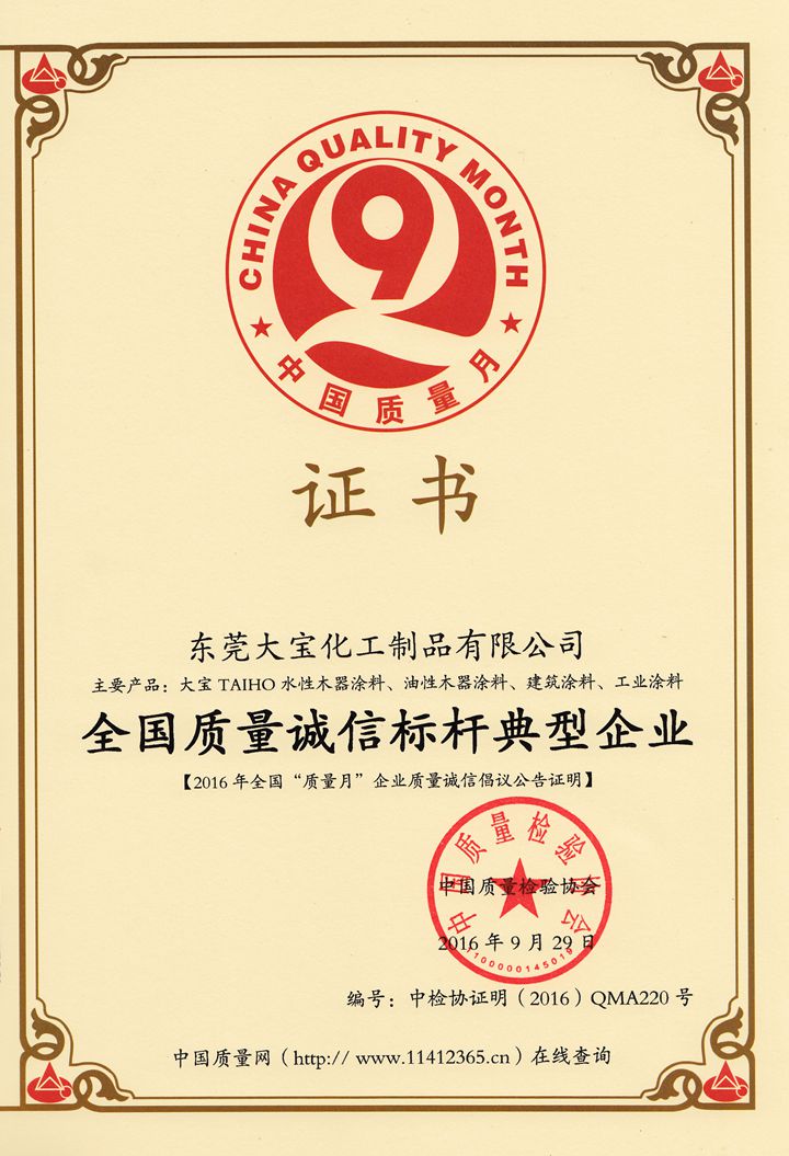 為推進(jìn)建設(shè)質(zhì)量強(qiáng)國,按照國務(wù)院辦公廳印發(fā)《貫徹實(shí)施質(zhì)量發(fā)展綱要2016年行動(dòng)計(jì)劃》的要求,并具體部署:中國質(zhì)量檢驗(yàn)協(xié)會(huì)繼續(xù)組織開展“企業(yè)質(zhì)量誠信倡議”專題活動(dòng),助力“中國制造”品牌提升。中國質(zhì)量檢驗(yàn)協(xié)會(huì)組織開展的“企業(yè)質(zhì)量誠信倡議”專題活動(dòng),對(duì)供給側(cè)改革、提升“中國制造”的品牌形象具有重要的意義,“全國質(zhì)量誠信標(biāo)桿典型企業(yè)”的授予,意味著大寶漆在企業(yè)誠信、產(chǎn)品質(zhì)量上做的努力獲得了廣大消費(fèi)者的認(rèn)可!