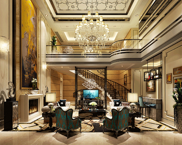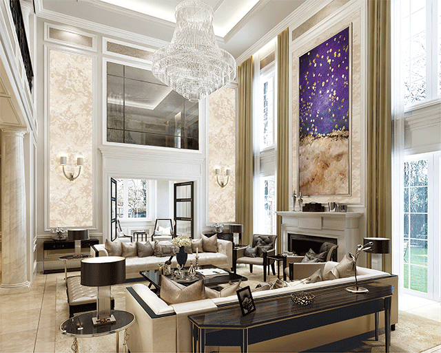 歐式客廳頂部喜用大型燈池,并用華麗的枝形吊燈營(yíng)造氣氛。門(mén)窗上半部多做成圓弧形,并用帶有花紋的石膏線勾邊。室內(nèi)有真正的壁爐或假壁爐造型。墻面一般使用高檔藝術(shù)壁材,或優(yōu)質(zhì)環(huán)保的藝術(shù)涂料,如造型多樣的大寶L’opera樓貝進(jìn)口藝術(shù)涂料,來(lái)烘托豪華效果。