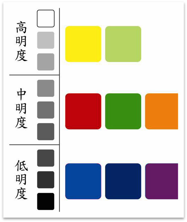 明度是色彩調和最具影響力的因素,大部分色彩對比產生的不調和狀況,均可藉由調整明度來改善,接下來介紹幾種以明度為主配色法,以同一明度為主,利用不同色相作變化。