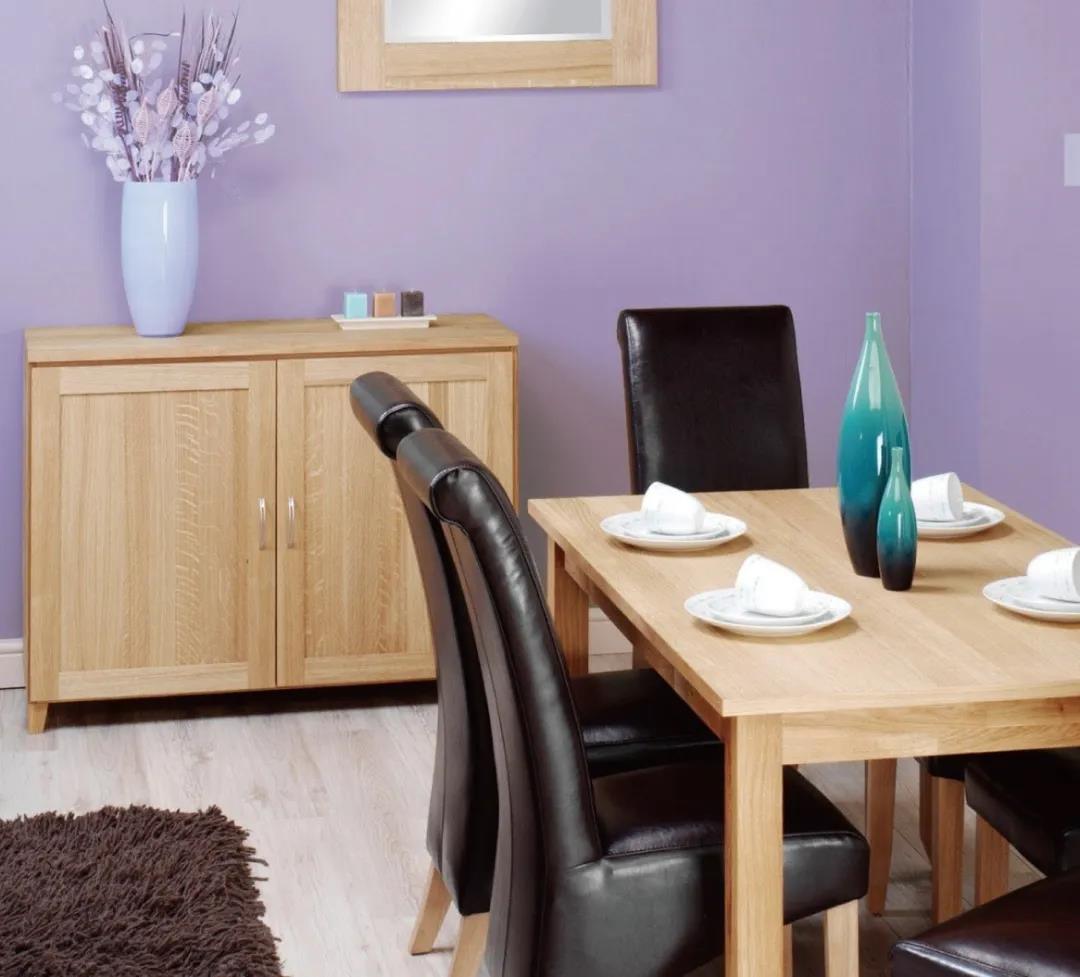 以紫色為餐廳的主色調,搭配原木色餐桌和柜子、黑色椅子,并配以同色系花束點綴,拉大與墻面背景色的差異,使整體空間具有立體感。