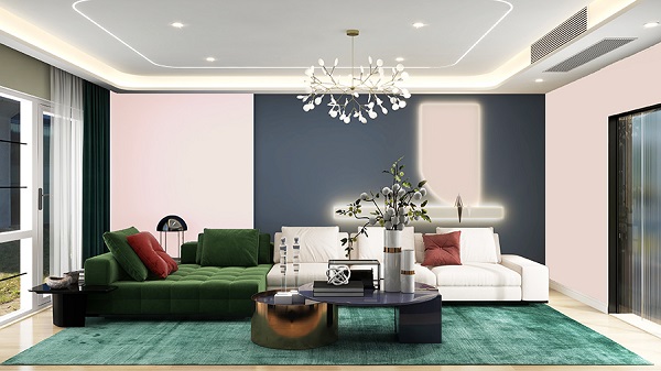 想讓藕粉色空間更具個性?大寶設(shè)彩團隊建議融入藍色或墨綠色等冷色系,為整體注入一抹鮮活的現(xiàn)代氣息。這種冷暖色調(diào)的對比,既與藕粉色形成視覺沖突,又在對比中尋求和諧,亦可加入金屬質(zhì)感的擺件或通透的玻璃飾品,為平凡的日子制造更多趣味。