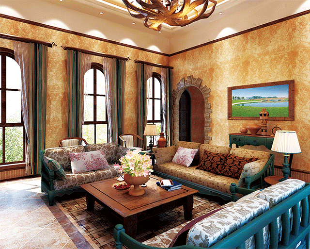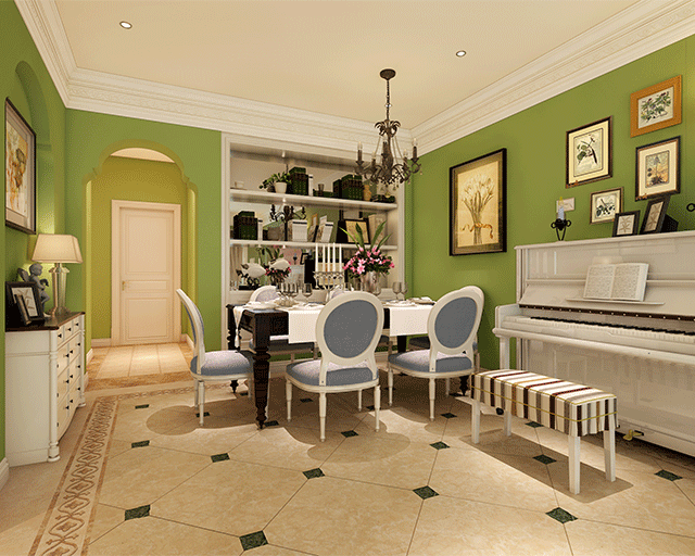 歐式田園風(fēng)格在設(shè)計上講求心靈的自然回歸感,喜歡把一些精細的后期配飾融入到設(shè)計風(fēng)格之中,體現(xiàn)一種安逸、舒適的生活氛圍。通常大量使用碎花圖案的各種布藝和掛飾,墻壁上也并不空寂,壁畫和裝飾的花瓶都使它增色不少,鮮花和綠色的植物也是很好的點綴。